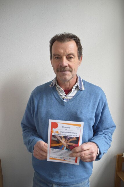 Bildunterschrift: Martin Kamps von der Pflege- und Wohnberatung informiert beim 14. Stadtteilstammtisch über bestehende Wohnangebote und Unterstützungsmöglichkeiten.