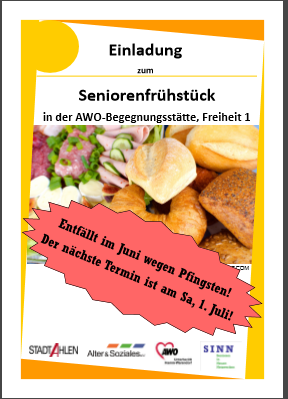 Aufgrund der Pfingstfeiertage entfällt am ersten Samstag im Juni das Seniorenfrühstück in Zusammenarbeit des Projektes „Altengerechte…