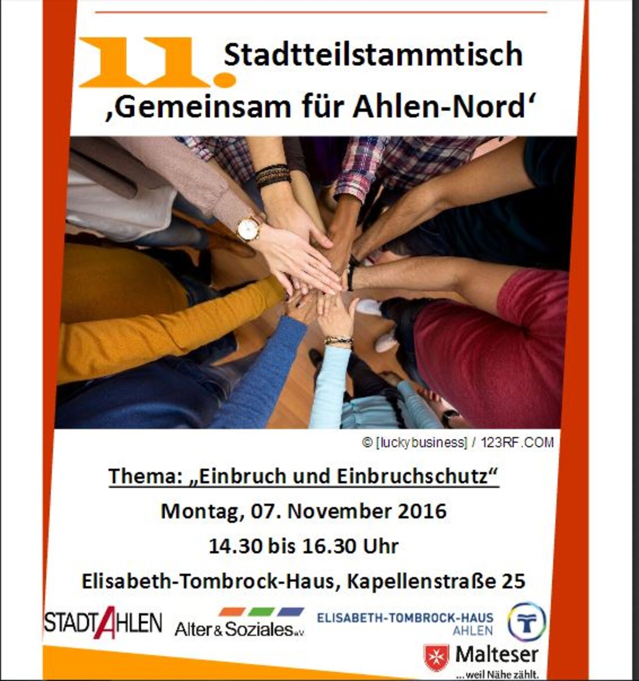 Am Montag, 07.11.2016 von 14.30 bis 16.30 Uhr, findet im "Elisabeth-Tombrock-Haus", Kapellenstraße 25, 59227 Ahlen, der 11. Stadtteil-Stammtisch des…