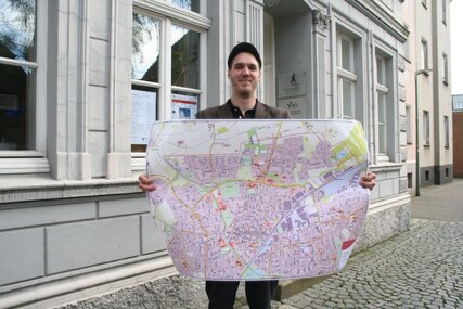 Der Ahlener Norden ist größer, als man vielleicht denkt. Was alles dazugehört, wird in dem Plan, den Ingo Gall zeigt, von einem roten Dreieck eingeschlossen. Der Stadtteil reicht von der Langst (rechts oben) hinüber bis zur Kläranlage (links), die südlichste Spitze (unten) ist der Bereich Südstraße, Südenmauer und Südwall – dort, wo sich Bahnlinie und Werse kreuzen. Dienstsitz des Projektbeauftragten ist die Wilhelmstraße 5. Bild: A.Wittmann