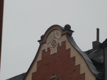 Ist Ihnen dieser Giebel, diese Fassade schon einmal aufgefallen? Ist Ihnen dabei auch bewusst worden, dass im Giebel ein Kreis mit einem Paragrafen abgebildet ist (mit der linken Maus-Taste in das Bild klicken und es vergrößert sich).