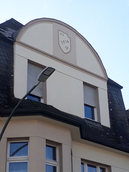 Der Giebel dieses Hauses ist rechts liegend kurz hinter dem Bahndamm anzutreffen, da, wo sich die Straße in Rottmannstraße und Beckumer Straße teilt.