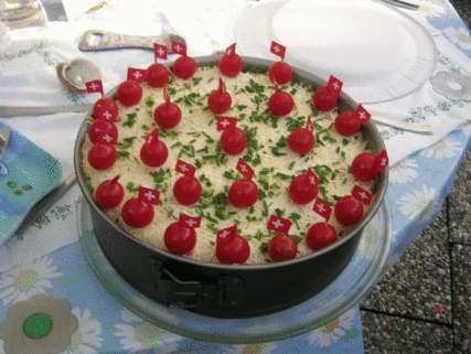 Die Salattorte mit Cocktailtomaten verzieren. Dazu nehme man Zahnstocher, um die Tomaten fest zu setzen. Ich hatte kleine Fähnchen-Spieße. Den Springformrand vorsichtig abnehmen. Mit einem elektrischen Messer die Torte aufschneiden. Mit Salatsoße reichen.