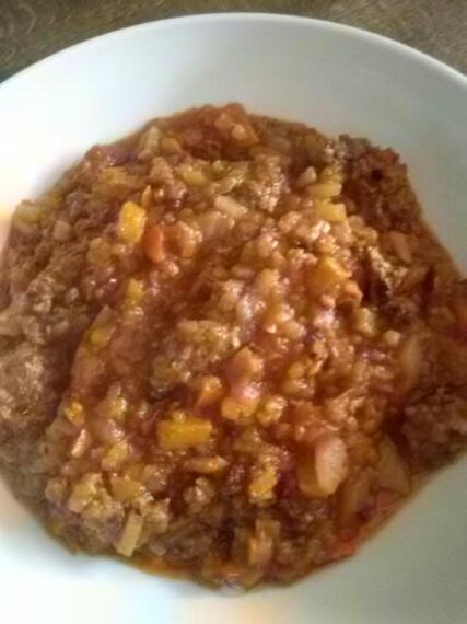 Zuerst brate ich das Gehackte in Butterschmalz schön kross und krümelig an und würze schon einmal mit Salz und Pfeffer. Nun gebe ich die klein geschnittenen Zwiebeln und die in hauchdünnen Ringen geschnittene Porree-Stange dazu und schwitze sie mit an. Auch den Hokkaido-Kürbis, den ich gewaschen, durchgeschnitten entkernt und in kleine Stücke geschnitten habe, schwitze ich mit an. (Der Hokkaido ist übrigens ein Kürbis, den man mit Schale essen kann.) Die Kartoffeln lasse ich auch etwas mit anschmoren und lösche das Ganze mit den Tomaten und der Fleischbrühe ab. Ich gebe Majoran dazu, leider bekam ich bei uns im Dörfchen keinen frischen Majoran, habe mich ja etwas hopp lá hopp für diesen Eintopf entschieden und nicht vorher an frischen Majoran gedacht.