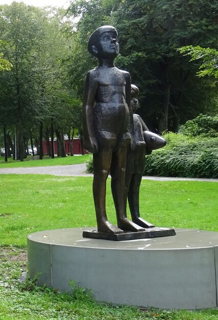Deutung hin, Deutung her. Diese Skulptur im Berliner Park heißt „Zwei Jungen mit Fisch“. Sie wurde 1964 vom Künstler Robert Paulmichl geschaffen und wurde im Zuge der Gestaltung des Berliner Parks in den Sechzigern dort aufgestellt.