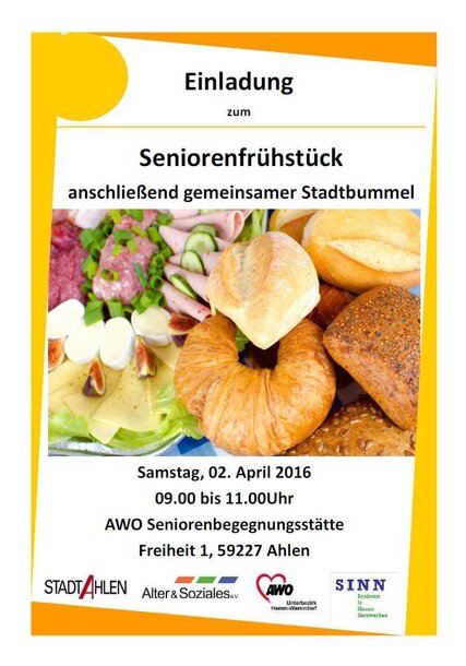 Am Samstag, den 02. April 2016 findet zum zweiten Mal von 09.00 bis 11.00 Uhr, das Seniorenfrühstück statt. Anschließend besteht wieder die Möglichkeit eines gemeinsamen Stadtbummels.