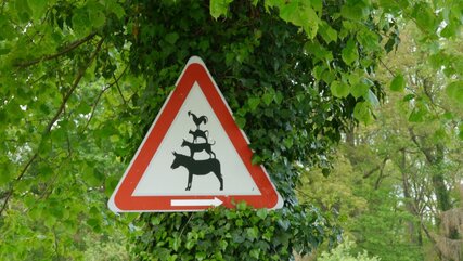 Dort war an einem Baum das Schild mit den vier Bremer Stadtmusikanten angebracht, das in Richtung einer Scheune den Weg wies.