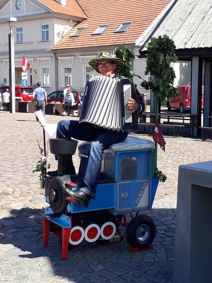 Der abgelichtete Straßenmusikant fiel nicht nur durch seine volkstümliche Musik auf, das Gefährt, eine Lokomotive als Sitzgelegenheit hielt auch so manchen Passanten auf und lud zum Verweilen ein.